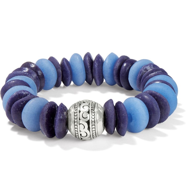 A large spherical bead to match the Mingle Collection is surrounded by beautiful blue semi-precious and recycled glass beads on this comfortable stretch bracelet. Stack it with your favorite silver bracelets.