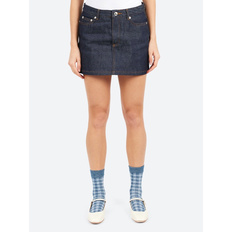The A.P.C. mini skirt in rigid indigo raw Japanese selvedge denim is a stylish and high-quality piece. This skirt's raw denim finish means it has not been pre-washed, allowing it to develop a unique patina over time with wear.Mid-riseButton closure with zi