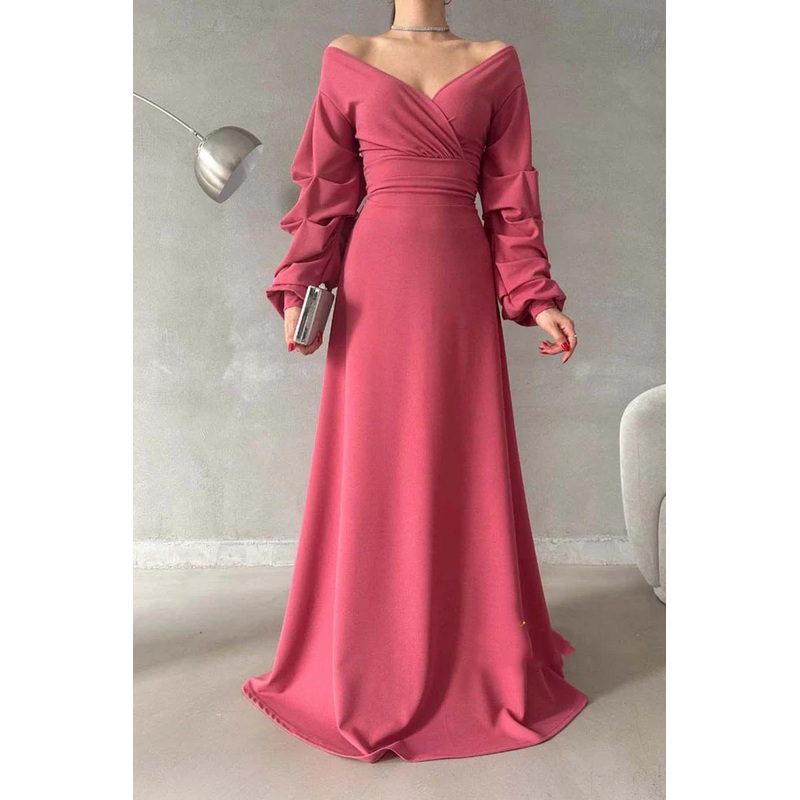 Minimalist A-line V-neck off shoulder bubble sleeve long ball evening dress