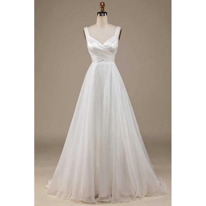 Minimalist Ivory Sleeveless Off Shoulder Low Neck and Floor Length Off Back Wedding Dress