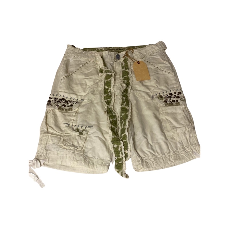 Details: Gray stitching on pockets, metal beading and stud work on pockets with a cream colored lace/green floral belt.