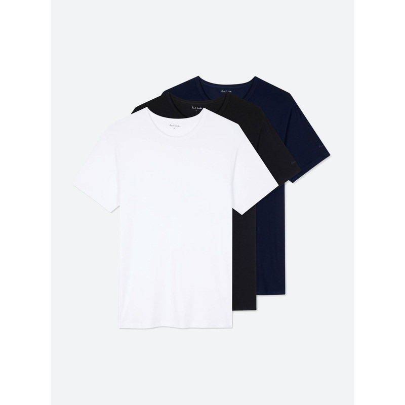 Made from soft modal with stretch for comfort, this three pack of men's t-shirts are offered in white, navy and black. Complete with a stitched on collar and tonal Paul Smith signature logo on the sleeve.Three packCrew neckShort sleevesStraight cutMaterial