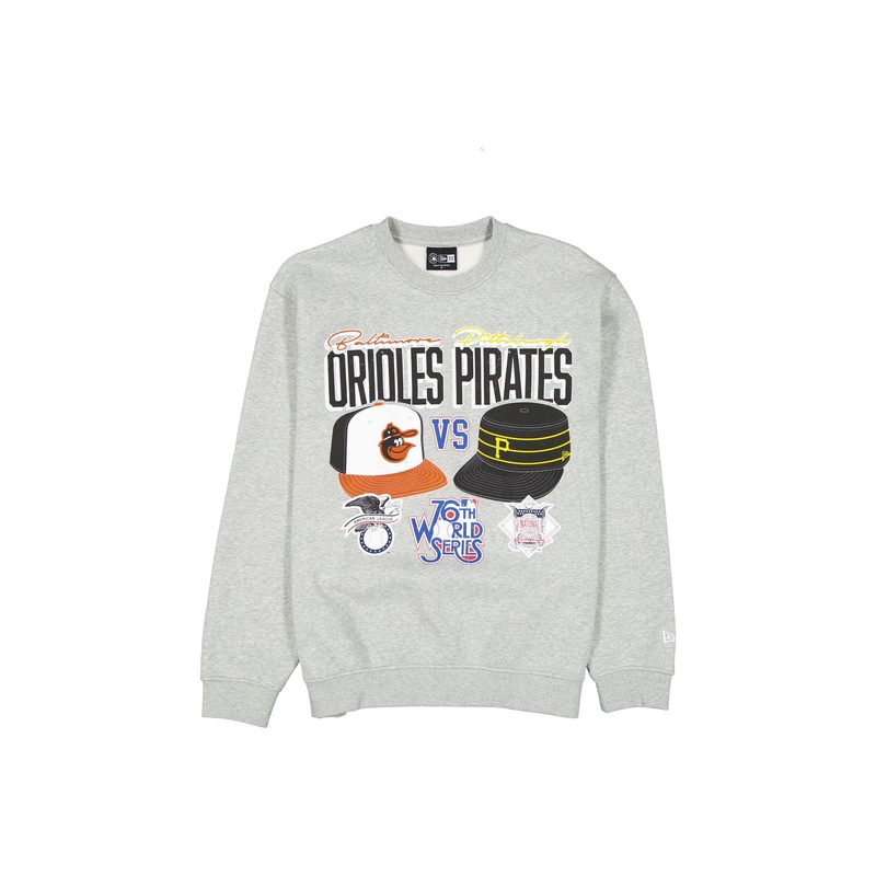 The MLB 1979 World Series Sport Classics Gray Crewneck features a dueling screen-printed Pittsburgh Pirates and Baltimore Orioles graphic at the front.