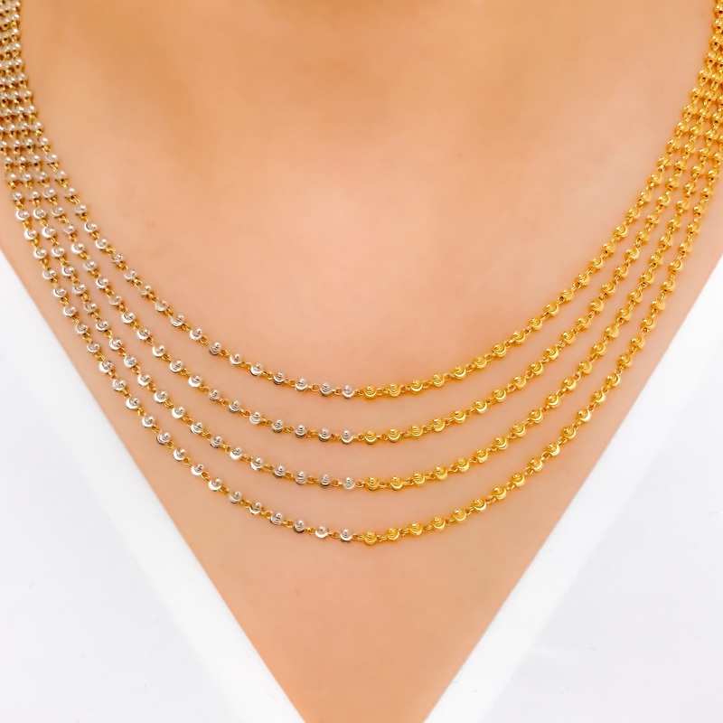 PRODUCT DETAILSGold Purity(karat):22k Gold Weight(grams):35.1Item Finish:Yellow + White GoldFirst RowLength:18"Fourth Row Length: 20"Adjustable Links: 0.6" LinksLock Style:Hook w/ ClaspMatching Earrings: IncludedEarring Length: 2.2"Earring Post: Push Back