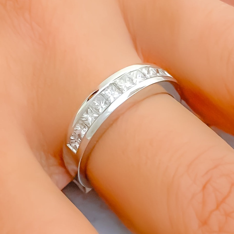 Crafted in 18k white gold and weighing 4.3 grams, this elegant ring showcases a modest design centered around a 0.66-carat princess-cut diamond in F-G color and VS quality. The princess cut offers a refined, understated sparkle, perfect for those who appreciate subtle sophistication. Sized at 6.75, with resizing options available, this ring is an ideal choice for everyday wear or special occasions, blending classic elegance with a modern touch that complements any jewelry collection.