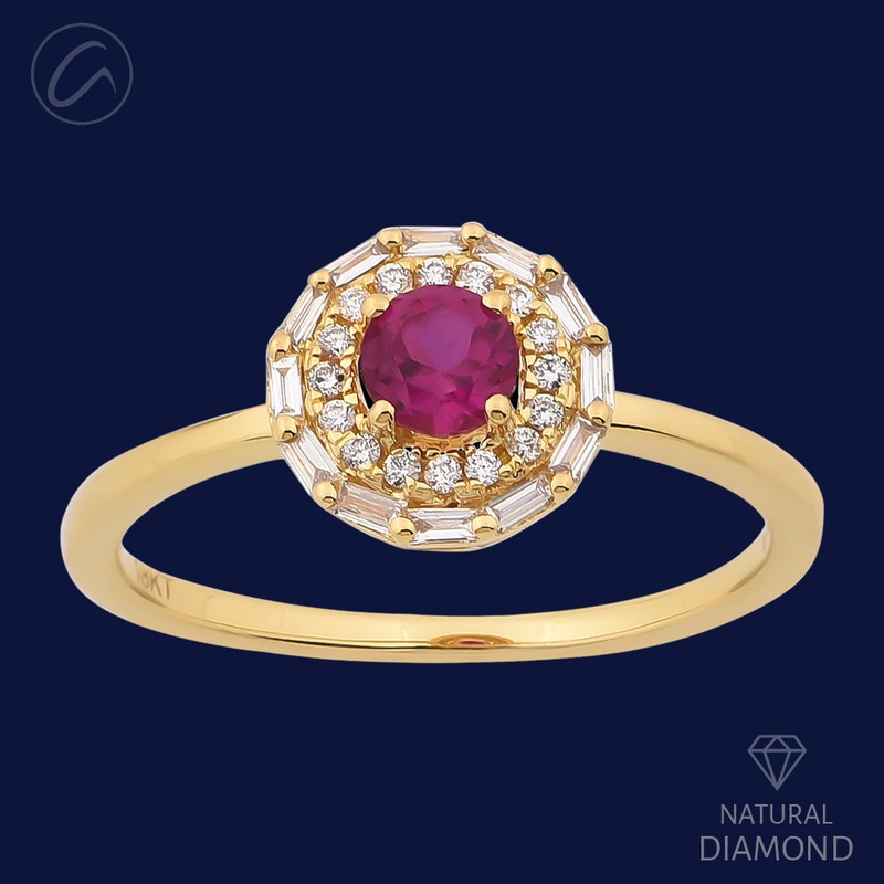 Discover understated elegance with our Modest Round 18K Gold + Diamond Ring. Crafted from luxurious 18k rose gold, weighing 2.0 grams, this exquisite piece features a captivating combination of round and baguette-cut diamonds. With a diamond weight of 0.20ct, radiating in F-G color and VS quality, it exudes timeless allure. Adorned with a round-shaped cultured ruby, this ring adds a touch of sophistication. Available in size 6.25, with ring sizing options for a perfect fit.