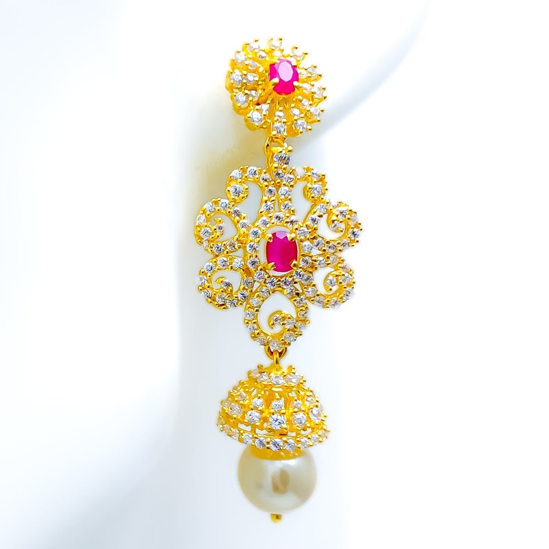 These modish 22k gold jhumki earrings effortlessly combine contemporary flair with classic charm. Weighing 13.2 grams, they offer a perfect balance of luxury and comfort. The yellow gold finish exudes warmth and elegance, while the cubic zirconia stones add a touch of sparkle. With a 2-inch hanging jhumki style, these earrings are ideal for both casual and formal occasions. The screw-back posts provide a secure and comfortable fit, ensuring they stay in place throughout the day. Elevate your jewelry collection with these fancy jhumki earrings, perfect for adding a stylish touch to any outfit.