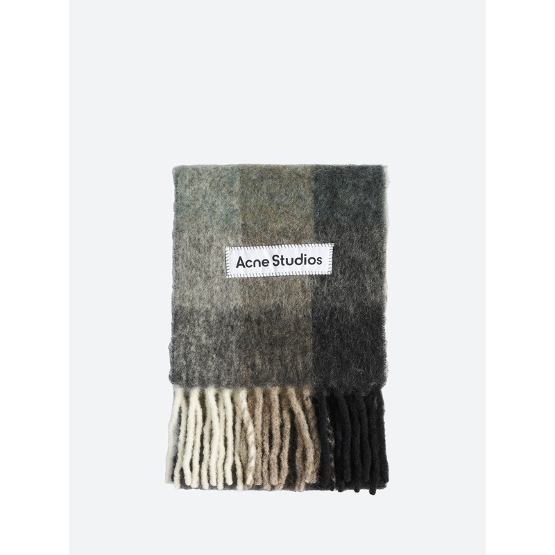 Acne Studios Vally checked scarf is made of a soft mohair blend, finished with fringed ends and an oversized logo patch.