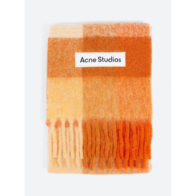 Acne Studios Vally checked scarf is made of a soft mohair blend, finished with fringed ends and an oversized logo patch.