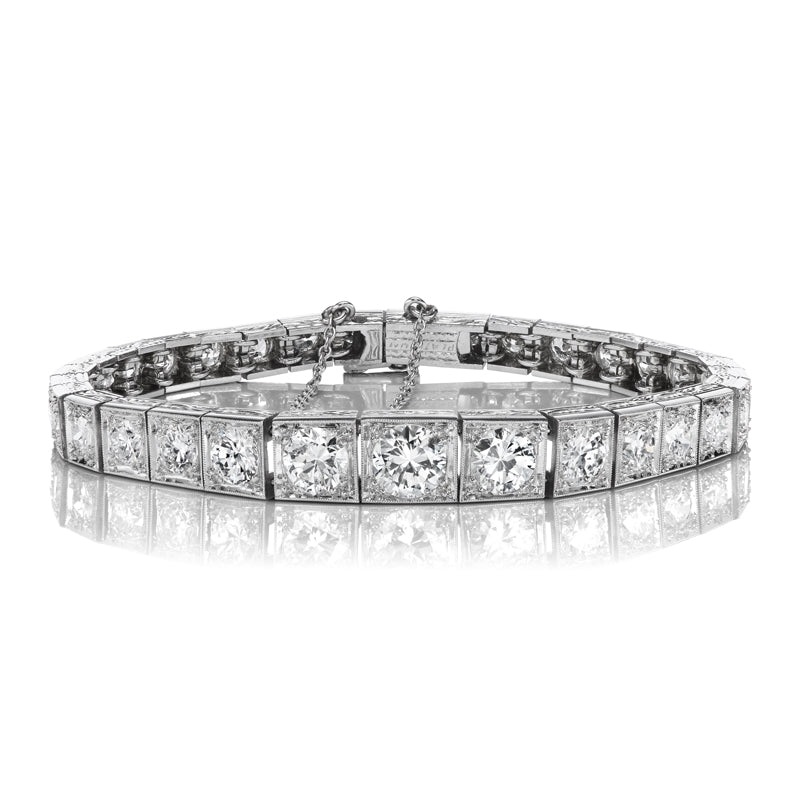 The Monet bracelet is an authentic antiquediamond tennis bracelet from the Art Deco era circa 1920. The bangle features 33 Transitional Cut diamonds of approximately 7.5 carats H-I color, SI clarity. The 33 stones are bead set into a Platinum tennis bracelet setting with beautiful millegrain detailing each square bead.