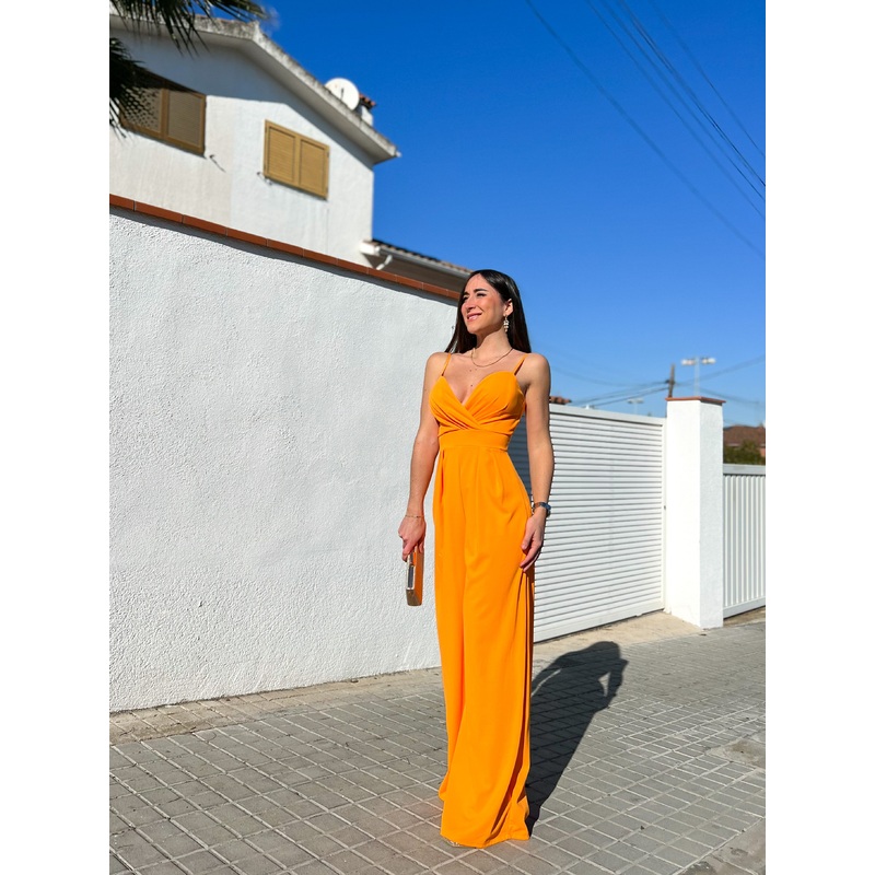 Mono crepe con escote corazn, tirantes regulables y copas en el pecho. Cintura ajustada pero elstica y pinzas en la cintura. Pantaln de pierna ancha