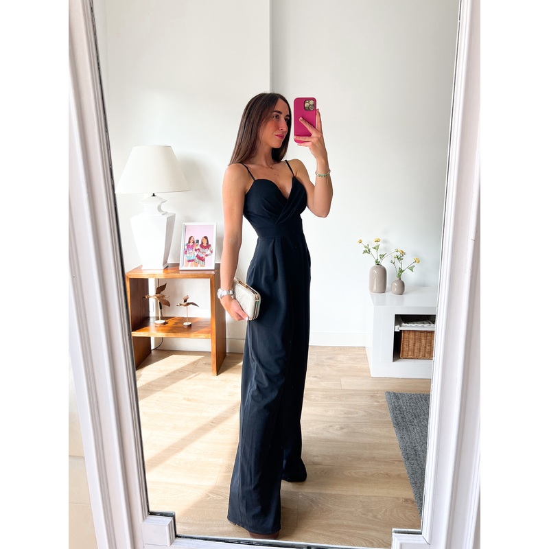 Mono crepe con escote corazn, tirantes regulables y copas en el pecho. Cintura ajustada pero elstica y pinzas en la cintura. Pantaln de pierna ancha
