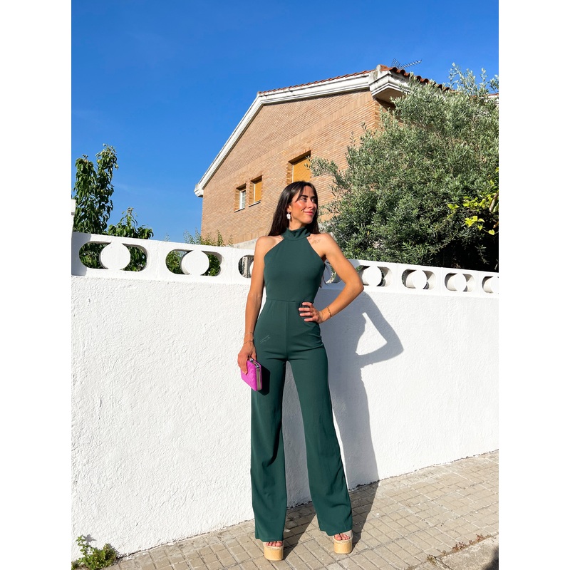 Mono ajustado con pantaln wide leg campana. Espalda descubierta y cuello halter Cremallera invisible. Tejido elstico. Color amarena.