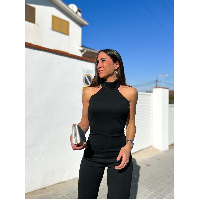 Mono ajustado con pantaln wide leg campana. Espalda descubierta y cuello halter Cremallera invisible. Tejido elstico. Color amarena.
