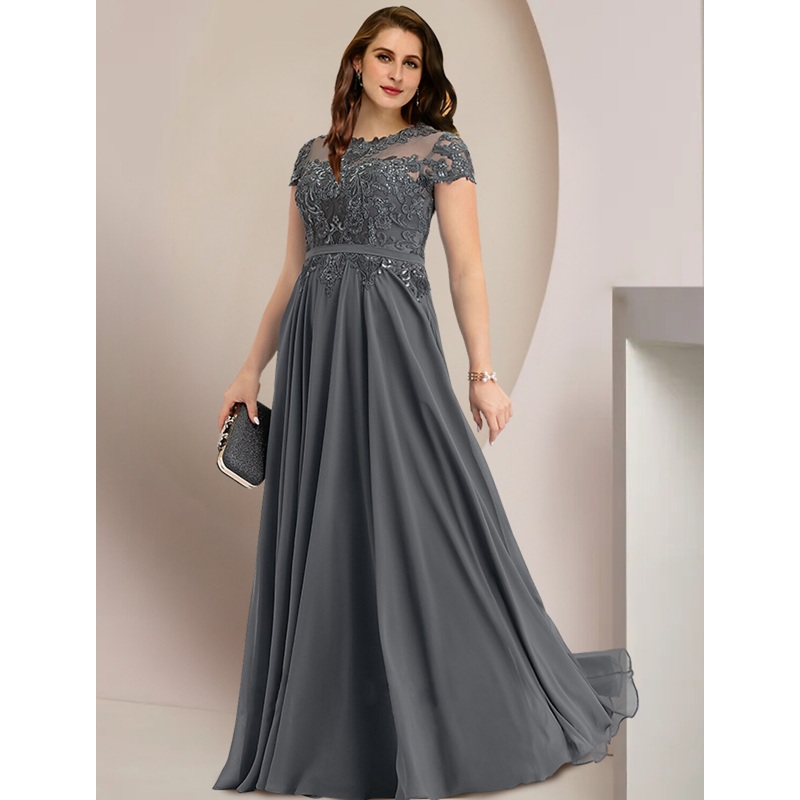 Mother of the Bride Dresses Plus Size Curve Hide Belly Wedding Guest Party Elegant Jewel Neck Floor Length Chiffon Lace Short Sleeve with Pleats Sequin