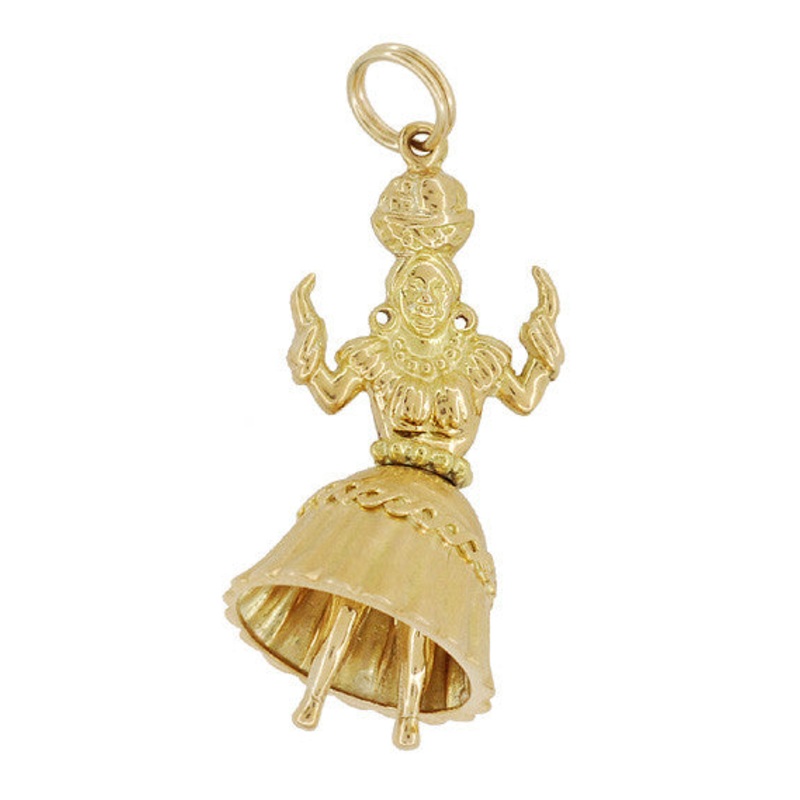 Circa 1960’s, this delightful vintage charm/pendant features a Portuguese-Brazilian Samba singer/dancer with a moveable lower body. Watch her skirt shake and shimmy! This shiny 18K gold Brazilian bombshell is an icon from Tropicalismo, (a.k.a. Tropicalia), a Brazilian art fusion movement of theatre, poetry and music. The charm might remind you of Carmen Miranda, famous as “the lady in the tutti-frutti hat”, as she too wore a fruit basket hat and carried bananas. This large pendant measures 1 5/16 inch high and 9/16 inch wide, and has a 14K yellow gold split ring bail that makes this charm perfect to wear on a favorite neckchain or easily and securely attaches this charm to a charm bracelet.
