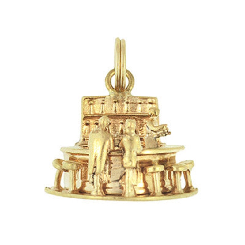 Go where everyone knows your name! This vintage moveable bartender, bar and customer charm is the perfect gift for your favorite bartender or someone working their way through college. The bartender actually moves across the bar to tend to his loyal customers! This handsome three dimensional high polish reminder of your local pub, is crafted in 14K yellow gold and measures 1/2 inch long by 3/4 inch wide. The charm features a 14K yellow gold split ring bail that makes this charm perfect to wear on a favorite neck chain or easily and securely attaches this charm to a charm bracelet.