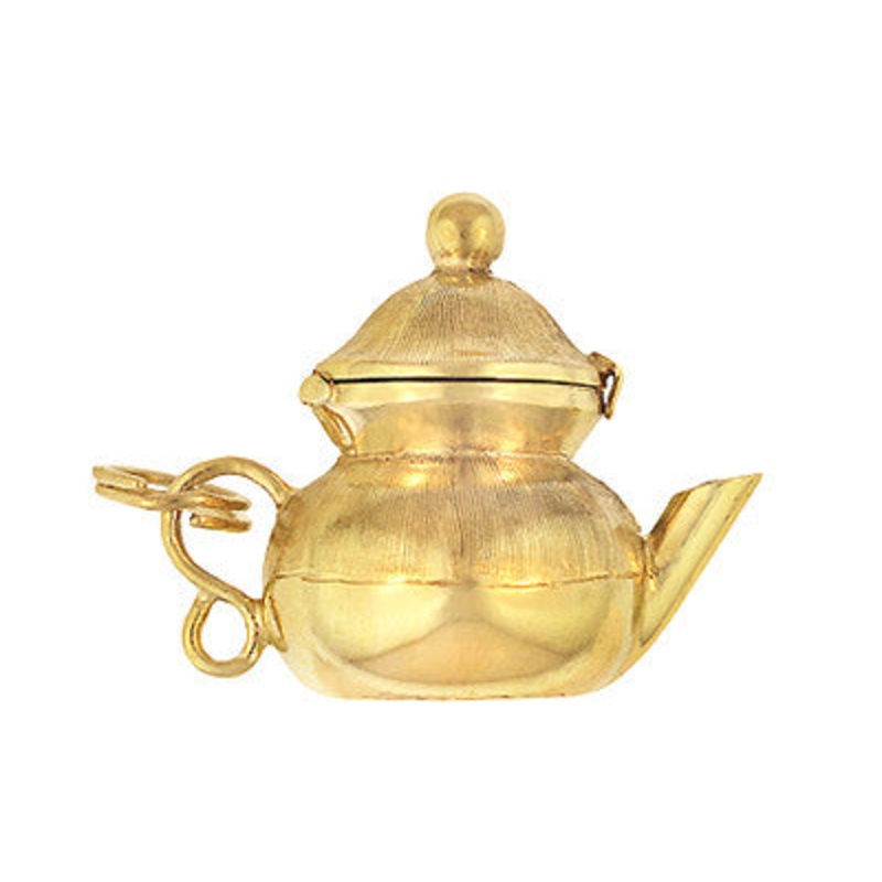 This little teapot With a beautiful high polish finish, this adorable three dimensional vintage 14K gold teapot charm, circa 1950’s, has a moveable hinged lid that actually opens! The top half of the lid and body of the tea pot have an eye-catching brushed finish while the bottom portions have a high polish finish.