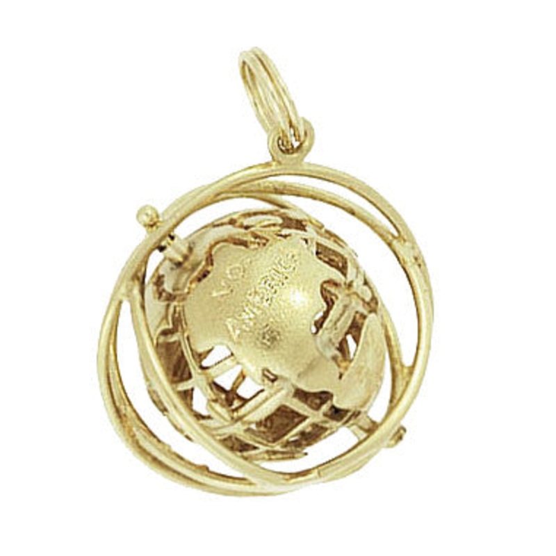 Circa 1964, this vintage New York World’s Fair Unisphere pendant in 14K yellow gold is sure to impress as it spins about on its axis! This wonderful three dimensional pendant is an exact replica of the famous Unisphere from the 1964 World’s Fair in Flushing Meadows Park in Queens, New York, viewed by millions as a symbol of global interdependence up to the present day. With the names of each continent etched on its surface, this dynamic movable pendant measures 3/4 inch in diameter. It features a 14K yellow gold split ring bail that makes this pendant perfect to wear on a favorite neck chain or easily and securely attaches this charm to a charm bracelet.