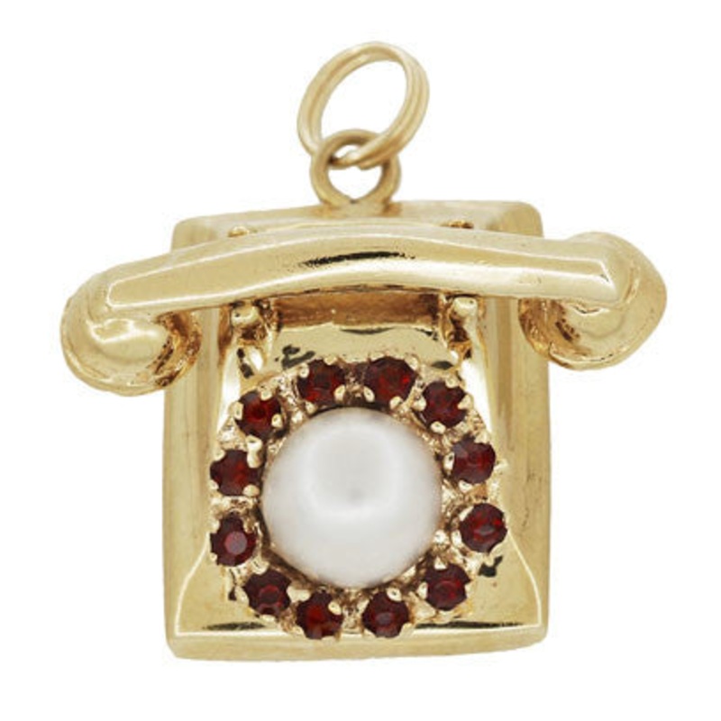 Moveable Vintage Telephone Pendant Charm in 14 Karat Yellow Gold With Pearl