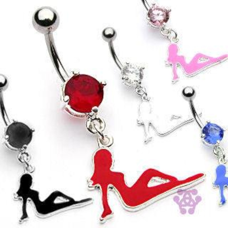 The 14 gauge mudflap girl dangle belly barbell is made from externally threaded 316L stainless steel. Only the 5mm ball end is removable.