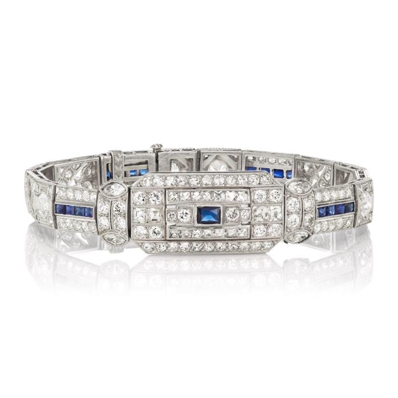 Art Deco Sapphire and Diamond BraceletThe Murling bracelet is an incredible and unique piece from the Art deco era. The bracelet features 174 diamonds of varying cuts, that combine for 5.40 carats of H-I color, VS clarity. Sixteen French cut natural sapphi