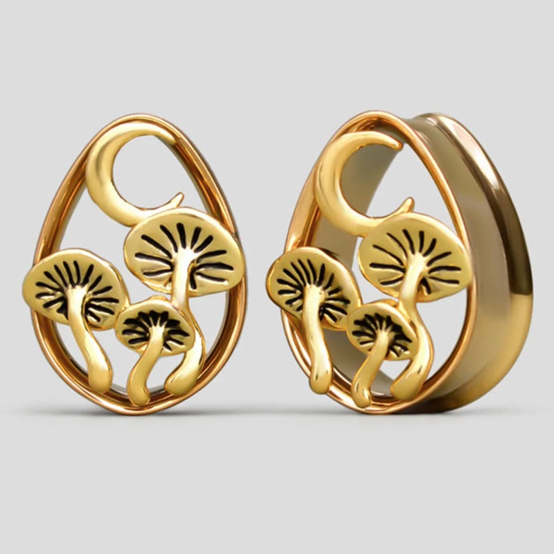 These double flare mushroom teardrop tunnels are made from gold PVD coated 316L stainless steel. Choose your size below.