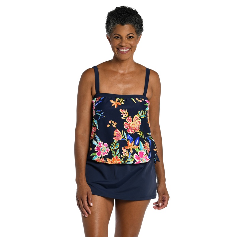 A garden’s worth of flowers in brilliant hues blooms against a canvas of indigo blue on this tankini. The loose-fitting blouson style is perfect for masking worry spots in the tummy area, while the side-tie detail adds a flirty touch. Remove the straps for a bandeau to eliminate those tan lines. Top sold separately.