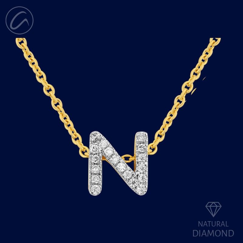 This exquisite 18k yellow gold necklace showcases an ‘N’ pendant adorned with a 0.05-carat round brilliant cut diamond of G-H color and VS clarity. Weighing 1.5 grams, the necklace measures 18 inches in length, features a 0.25-inch drop, and includes a 2-inch adjustable link for a customizable fit. Secured with a lobster ring lock, this piece combines personalized elegance with timeless luxury, making it an ideal accessory for daily wear or special occasions.