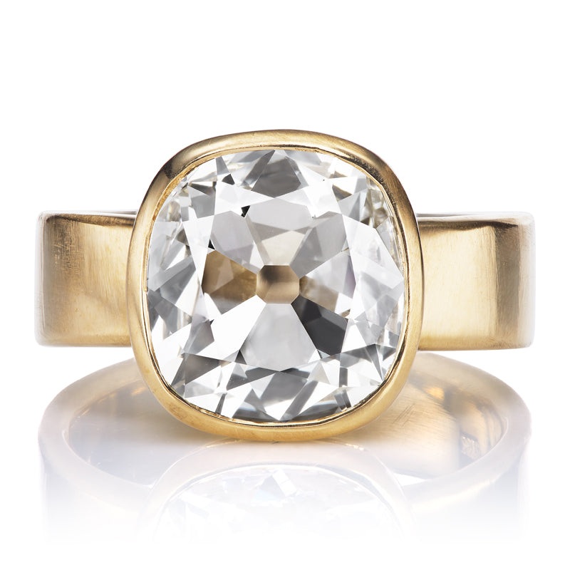 Antique Style Cushion Diamond in Yellow Gold Bezel SettingThe Naomi 3.01 ring is an AB original design made right here in NYC. The ring centers a GIA-certified 3.01 carat Antique Style Cushion Cut diamond of K color, VS1 clarity. The stone is set in an 18k