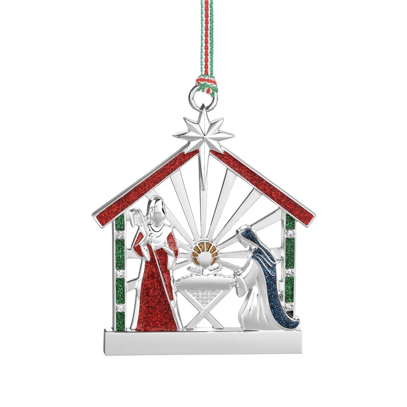 Update your festive collection with this superb silver plated Nativity scene Christmas tree decoration from Newbridge Silverware. This design features the holy family- Mary, Joseph, and baby Jesus highlighted with festive sparkle coloured enamel detail and