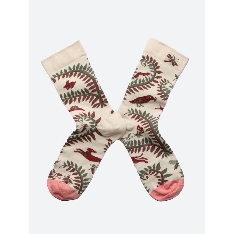 These mid-calf socks are made using premium Egyptian cotton and an elastane double thread.Old burgundy purple and cedar green Bird on natural backgroundPeach pink toeMaterialsFabric Content: 90% cotton, 8% polyamide, 2% elastaneMade in FranceSize GuideFits