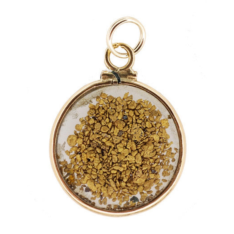 Circa 1970's, this unique pendant features genuine natural loose gold nuggets encased in a clear round pendant with a frame of 14K gold. A real treasure you or your loved one can carry with you every day, this charm measures 1 inch high by 13/16 inch wide