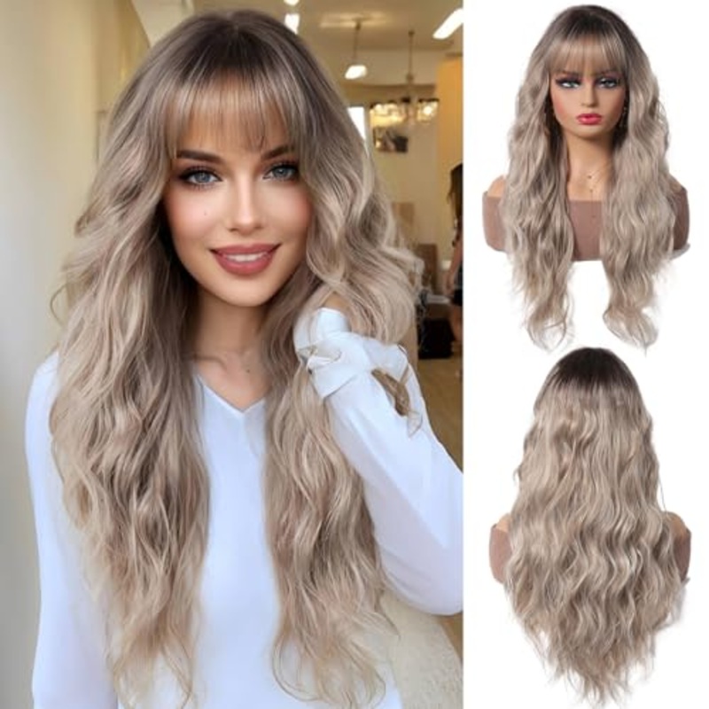 Natural Wavy Long Ombre Ash Blonde Wig With BangsKanekalon fiber which is suitable for long term use and it is the best fiber material for wig. Looks completely natural,Silky and smooth like real human hair, touch soft, easy to comb,minimumHair Length: 24