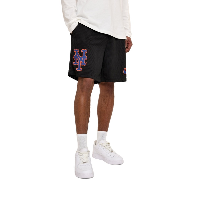 The New York Mets Mesh Shorts features a screen-printed Mets logo at the left leg with a team wordmark at the right leg.