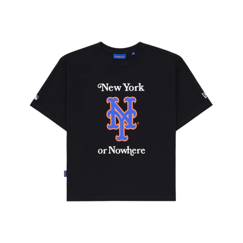 The New York or Nowhere x New York Mets Black Relaxed Logo T-Shirt features a screen-printed Mets logo and a New York or Nowhere wordmark at the front with a woven Mets tag at the rear.