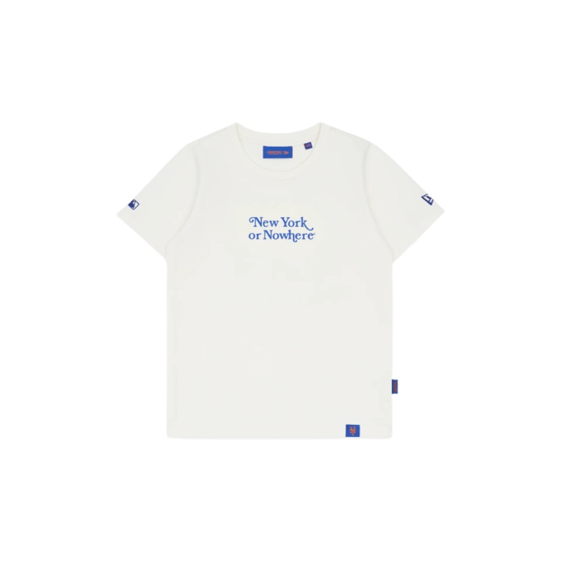 The New York or Nowhere x New York Mets Youth Chrome White T-Shirt features a screen-printed New York or Nowhere wordmark at the front and It Will Always Be New York or Nowhere at the rear.