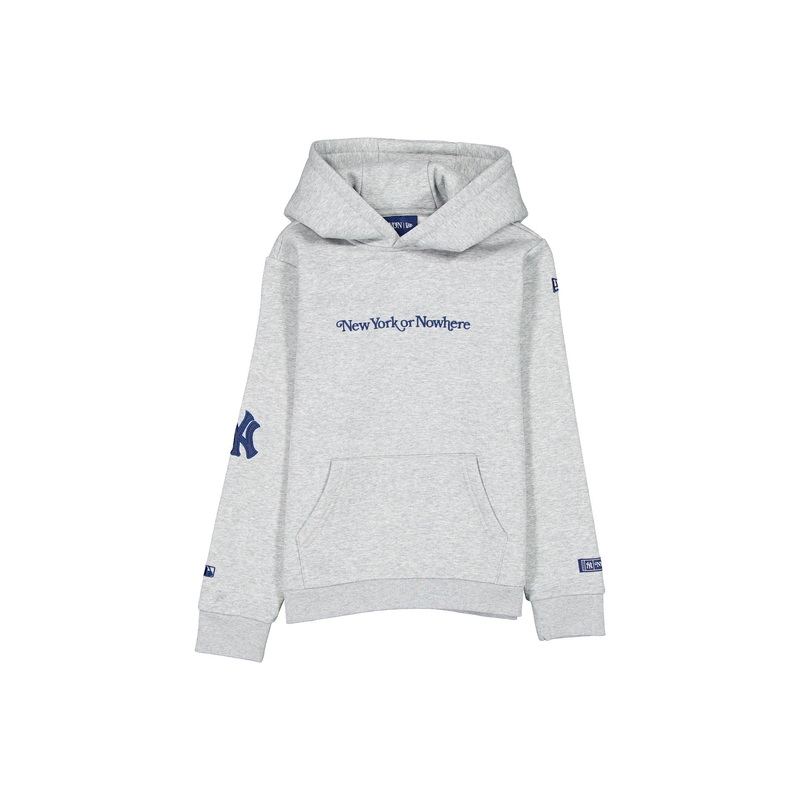 The New York or Nowhere x New York Yankees Gray Youth Hoodie features an embroidered New York or Nowhere wordmark at the chest with a kangaroo pocket at the front. Additional details include a Yankees logo and MLB Batterman logo at the right sleeve with a woven Yankees x NYON tag at the left sleeve.