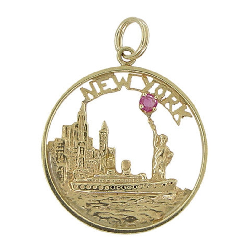 A great gift for your favorite New Yorker - or for you, this one of a kind vintage charm, circa 1960's, depicts the city skyline, the statue of liberty, a ship in the harbor, and is set with a ruby. Measuring 1 inch in diameter and featuring a 14K yellow g