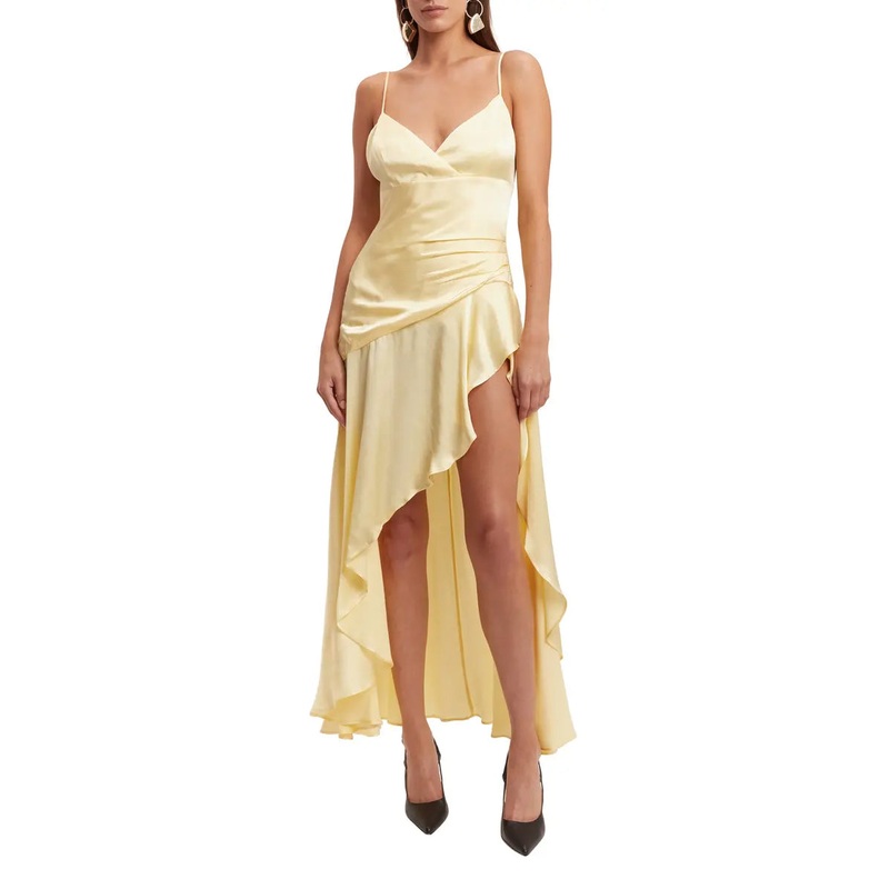 Noble and elegant slim shoulder strap off the shoulder ruffle edge mid length off the back evening dress