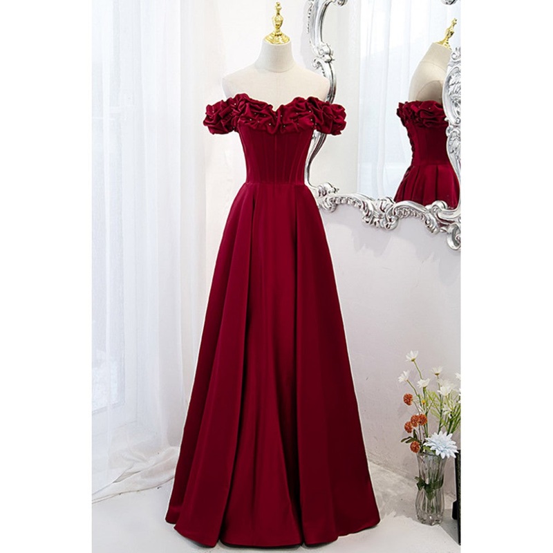 Noble and elegant wine red sleeveless off shoulder beaded ball dress with wine red A-shaped backless strap and ground length ruffled hem prom dress