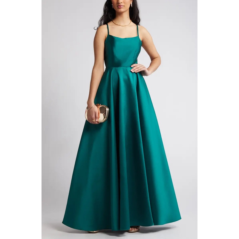 Be the first to review “Noble and minimalist satin thin shoulder strap A-shaped and ground length backless evening dress”
