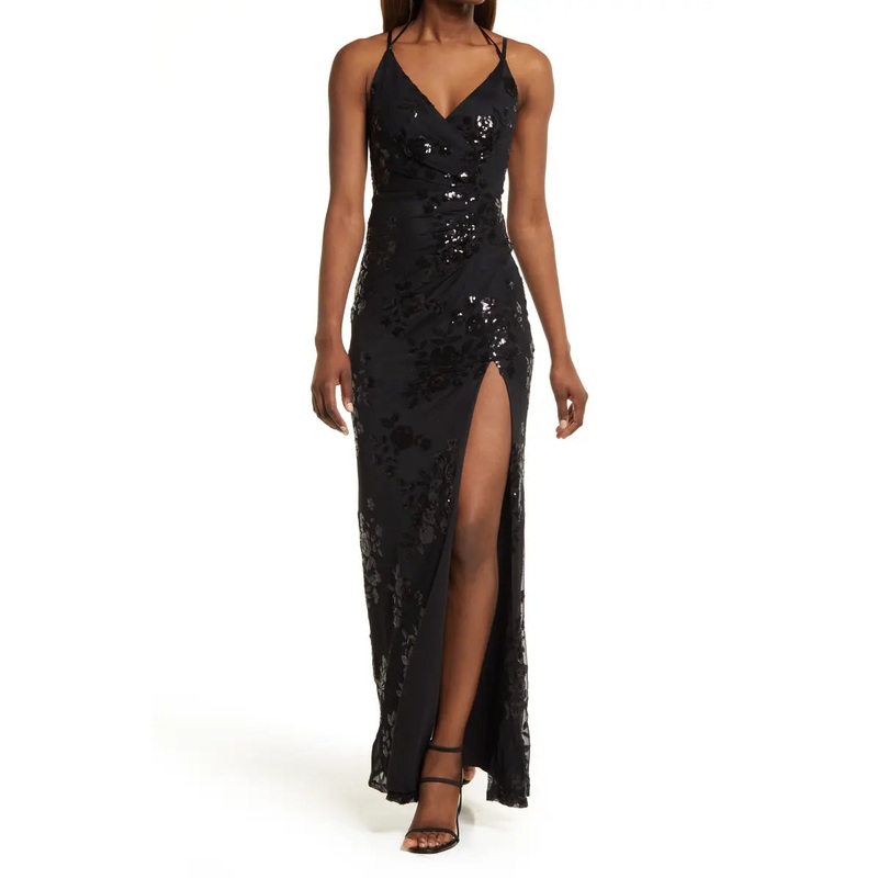 Noble slim shoulder strap off shoulder sequin pleated lace front slit prom dress