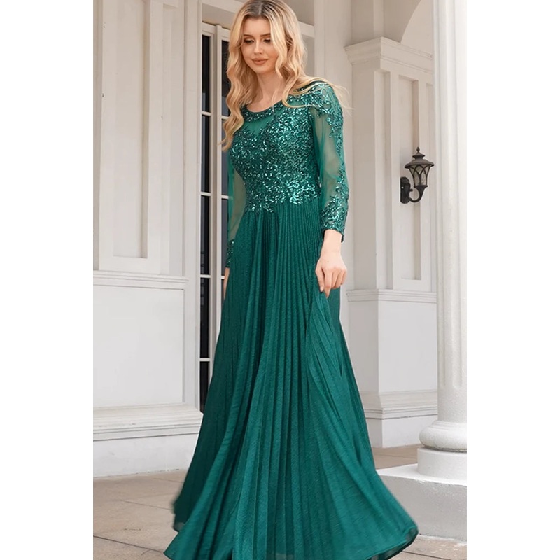 Noble sparkling A-shaped green low round neck long sleeved and ground length beaded Mother Of The Bride Dresses