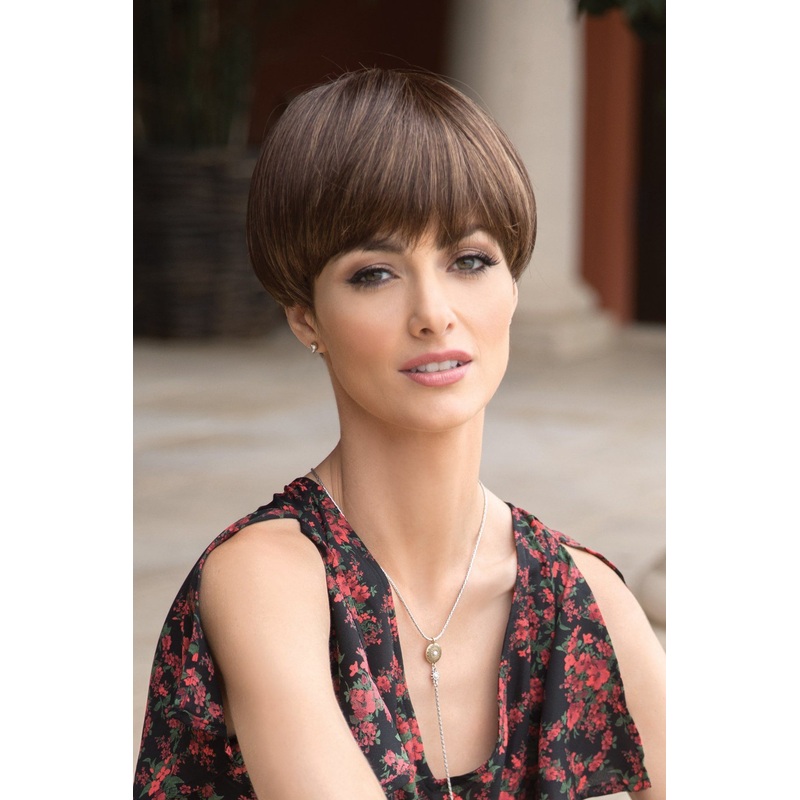 Discontinued item - Limited colors available - See belowSport this stylized, retro bowl cut wig with a chic modern twist.Length: Fringe 3.7", Crown 6.3", Nape 1.4"Weight: 2.6 ozCap Size: AverageColor Shown: Marble Brown-RColors: Iced Mocha-R, Marble Brown-