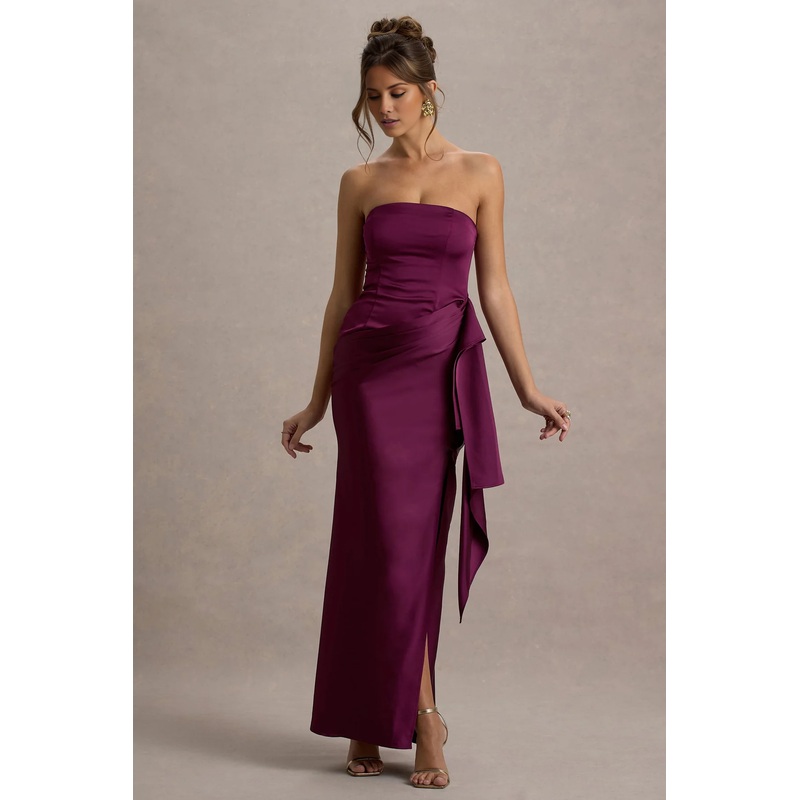 - Premium satin- Bandeau neckline- Invisible zip closure- Draped satin skirt- High-leg split- Maxi length- Built-in bra