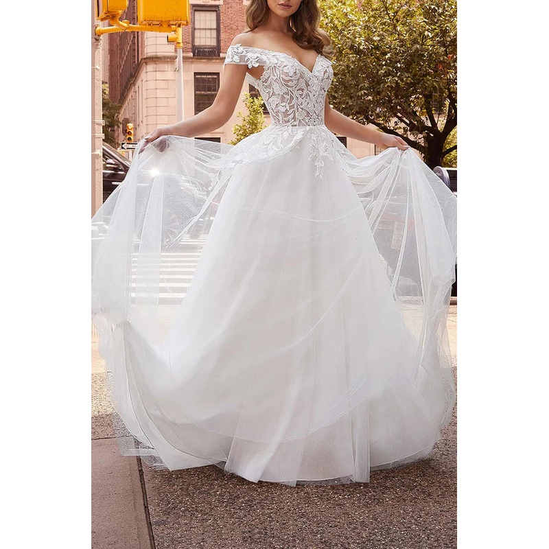 Off the shoulder lace decal with a simple white wedding dress paired with a detachable hem for the bride’s dress