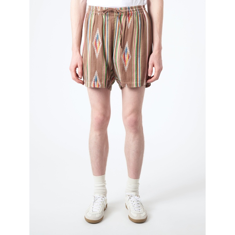Elastic waist pull-on short shorts. Jacquard weaving involves adding extra yarn in the warp or weft to add extra surface in the fabric to create patterns in the weave that have raised texture. Made by one tailor from beginning to end.Drawstring elastic wai