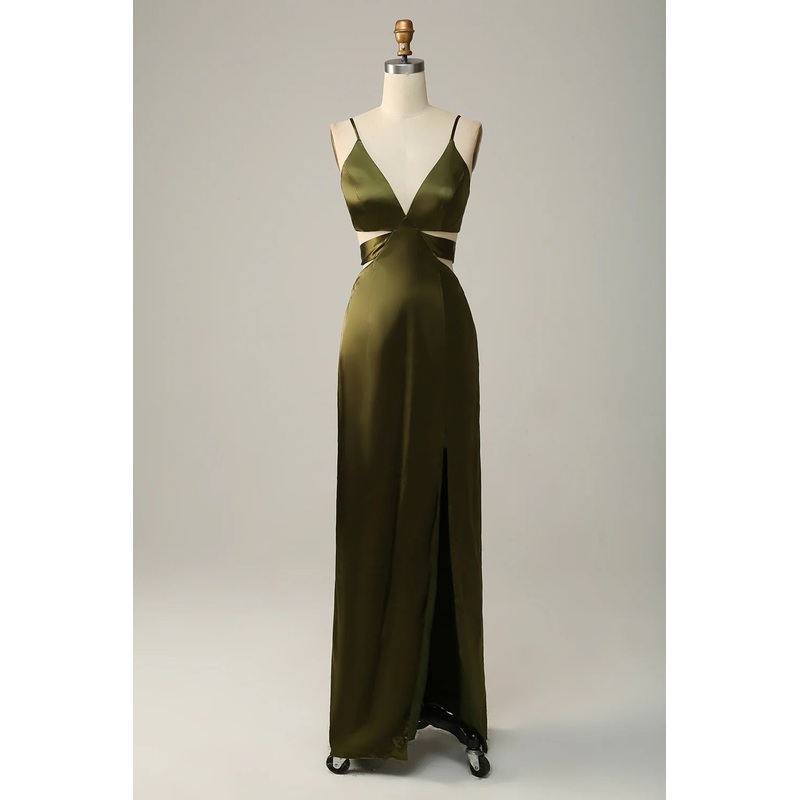Olive colored thin shoulder strap hollow satin bridesmaid dress