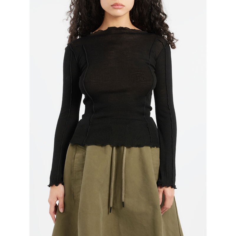 Baserange wool rib long sleeve with lettuce edge at neckline and hems.BoatneckExposed seamsLong sleevesLettuce edge at neckline and hemsMaterialsFabric Content: 100% woolMade in PortugalSize GuideSierra wears size S. She is 5'7"; bust 33"; waist 24"; hips